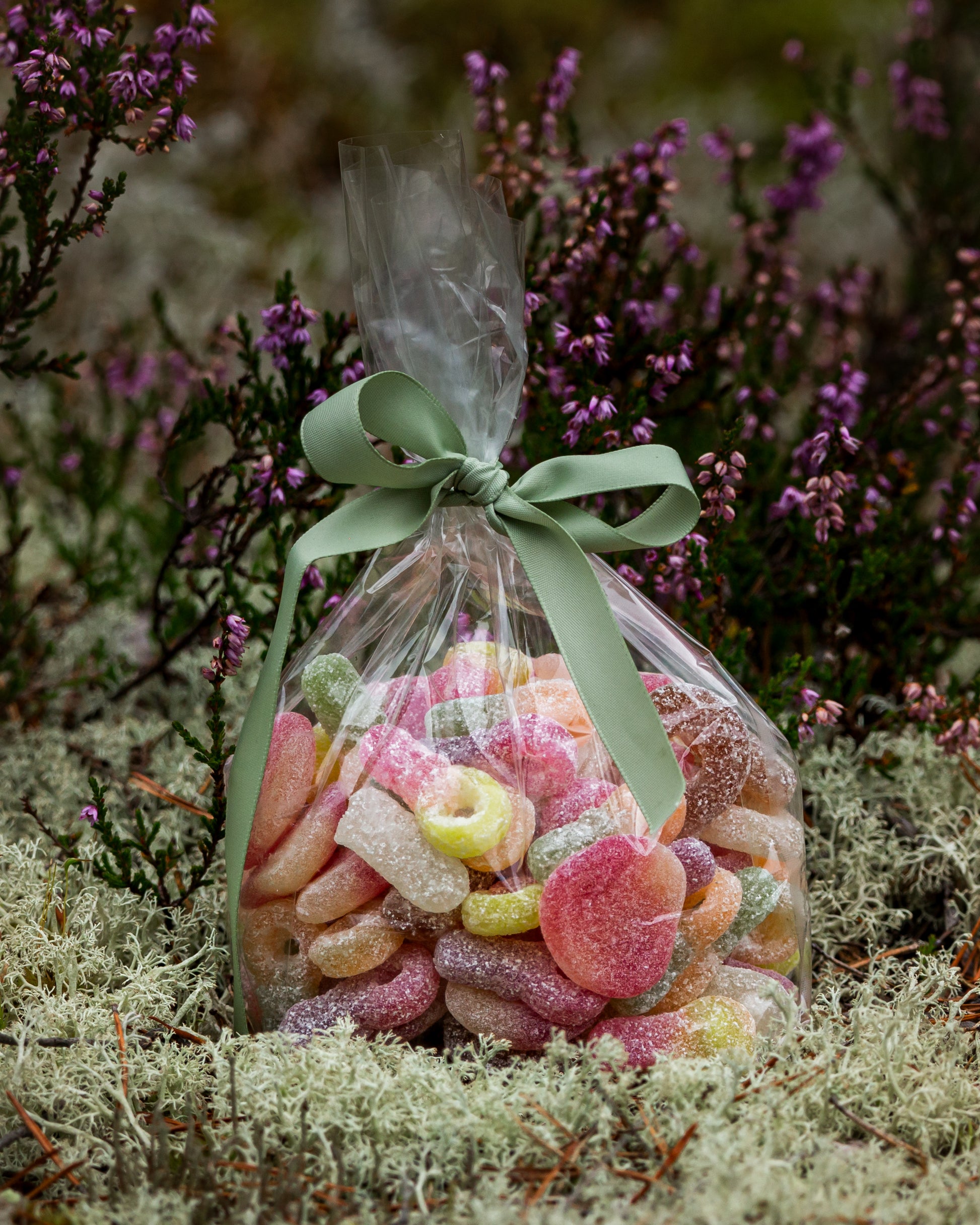 En sur påse med persikor, stora colanappar & små fruktnappar